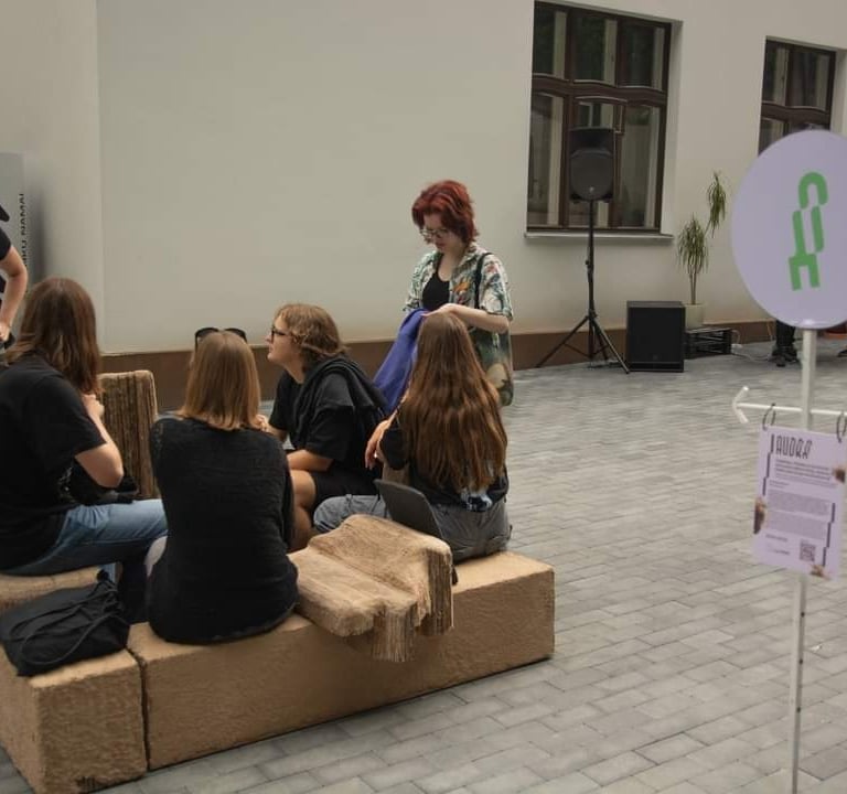 Šiuolaikinės muzikos festivalio Audra metu Kauno menininkų namuose pristatytas interaktyvus baldas-skulptūra „Pasiekus horizonte išnirusios salos krantą, audros blaškytas kūnas randa atramą”.